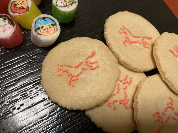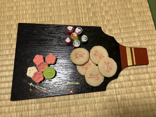 お正月らしい菓子器には華やかなお菓子が並びます。